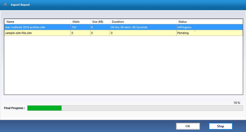 The time taken to export 2 GB OLM data to MBOX file format will depends upon the state of OLM files. If the OLM file is healthy then it takes around 15 – 25 minutes. But if the file is corrupted then no action will be taken up by the software.