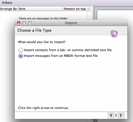 Check the radio button Import messages from an MBOX-format text file.